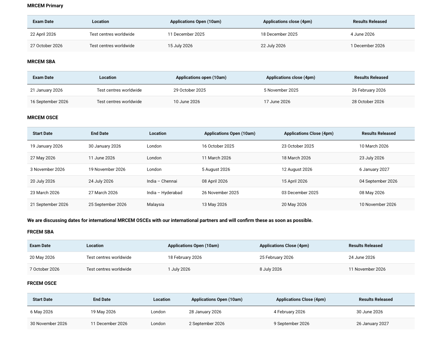 RCEM Exam Calendar